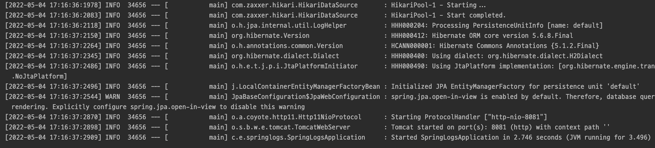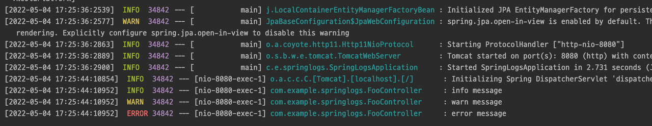 다음과 같이 콘솔창에서 로그가 기록되는 것을 볼 수 있다. 그런데 몇 개의 로그는 보이지 않는다. 그 이유는 로그 레벨은 기본적으로 [trace > debug > info > warn > error] 순이며 디폴트 설정이 info로 되어있기 때문에 trace와 debug 로그는 기록되지 않은 것이다.