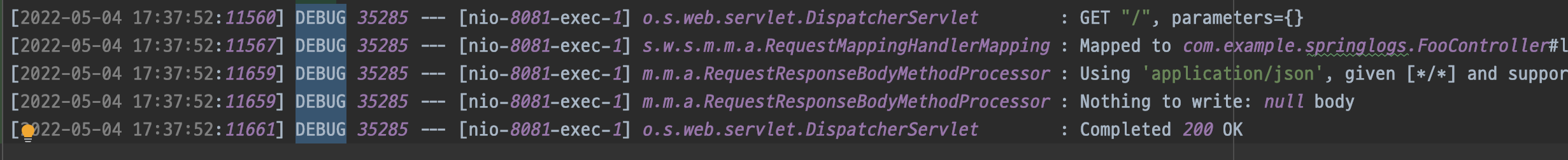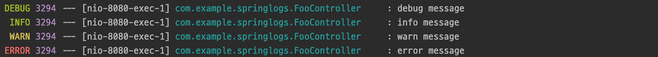 처음에 언급했던 바와 같이 로깅을 하면 앱 개발시 운영 중 발생하는 문제점을 모니터링하거나 추적하는 데 용이하고 데이터를 분석해 통계를 낼 수도 있다. 따라서 로그 레벨을 조절하여 콘솔에 출력하고 이를 기록하는 데에는 그만한 주어진 목적이 있다고 보면 된다. 콘솔 로그 수준을 변경하는 가장 간단한 방법은 application.yml이나 application.properties로 설정해주는 것이다.