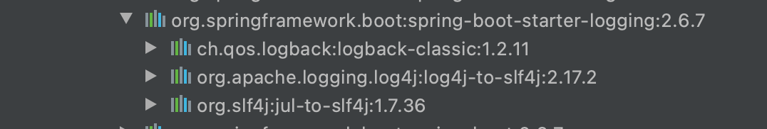 스프링 부트에선 기본적으로 Logback이 설정되어 있다. 다음과 같이 SLF4J의 3가지 모듈이 이어져 Logback과 연결된다. 다음과 같이 spring-boot-starter-logging 라이브러리에 기본적으로 설치되어 있다.