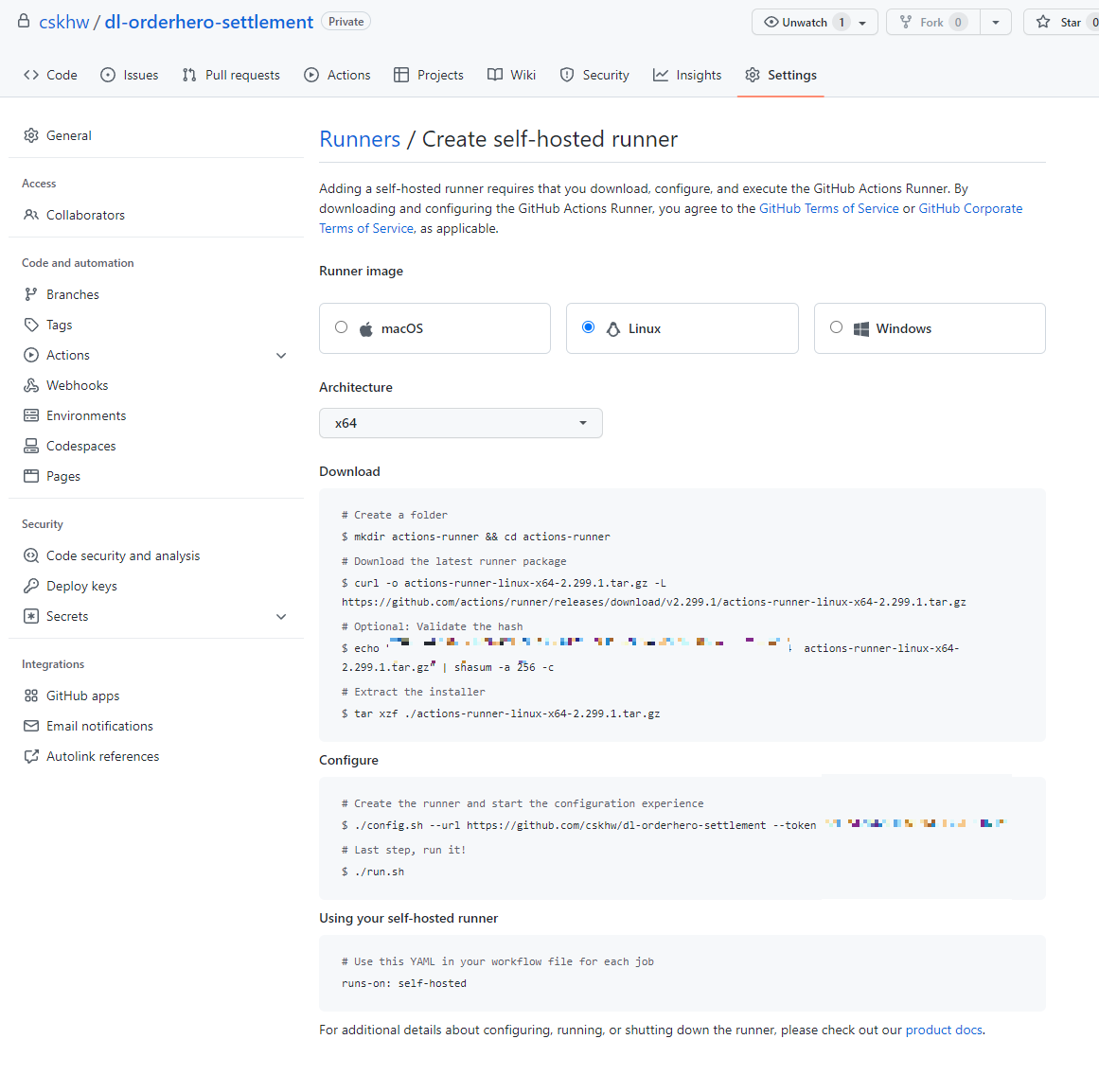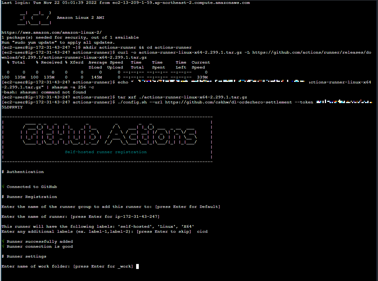 - $ echo "~~~~~~ actions-runner-linux-x64-2.299.1.tar.gz" | shasum -a 256 -c 명령어는 해시 확인하는 명령어이므로 스킵해도 됨(aws linux에 shasum 라이브러리가 없어서 실행 불가능, 외부 다른 방법으로 실행해서 확인해도 됨)