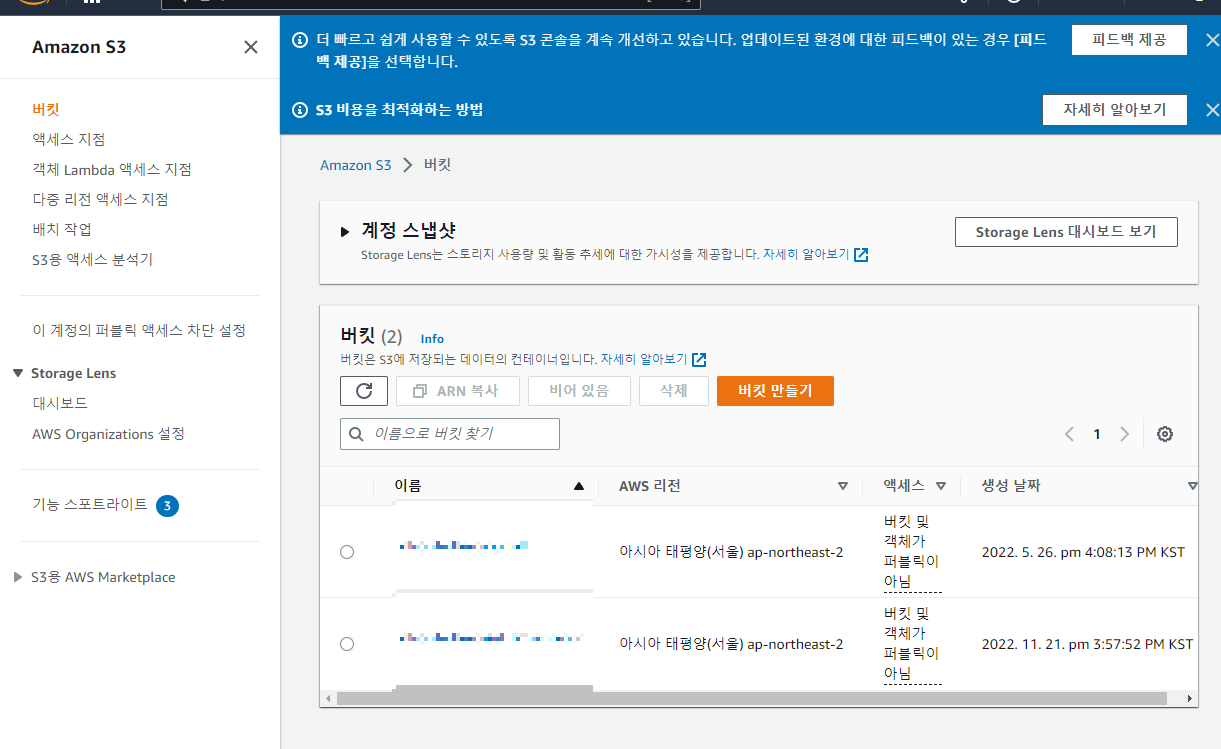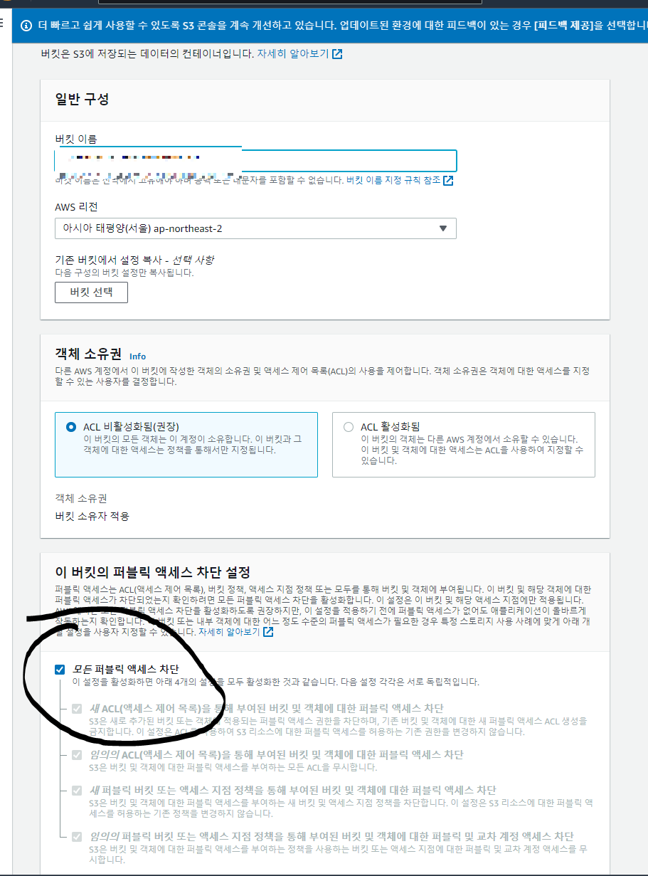 - S3에서 버킷 만들기 선택(s3이름은 고유하므로 가림)