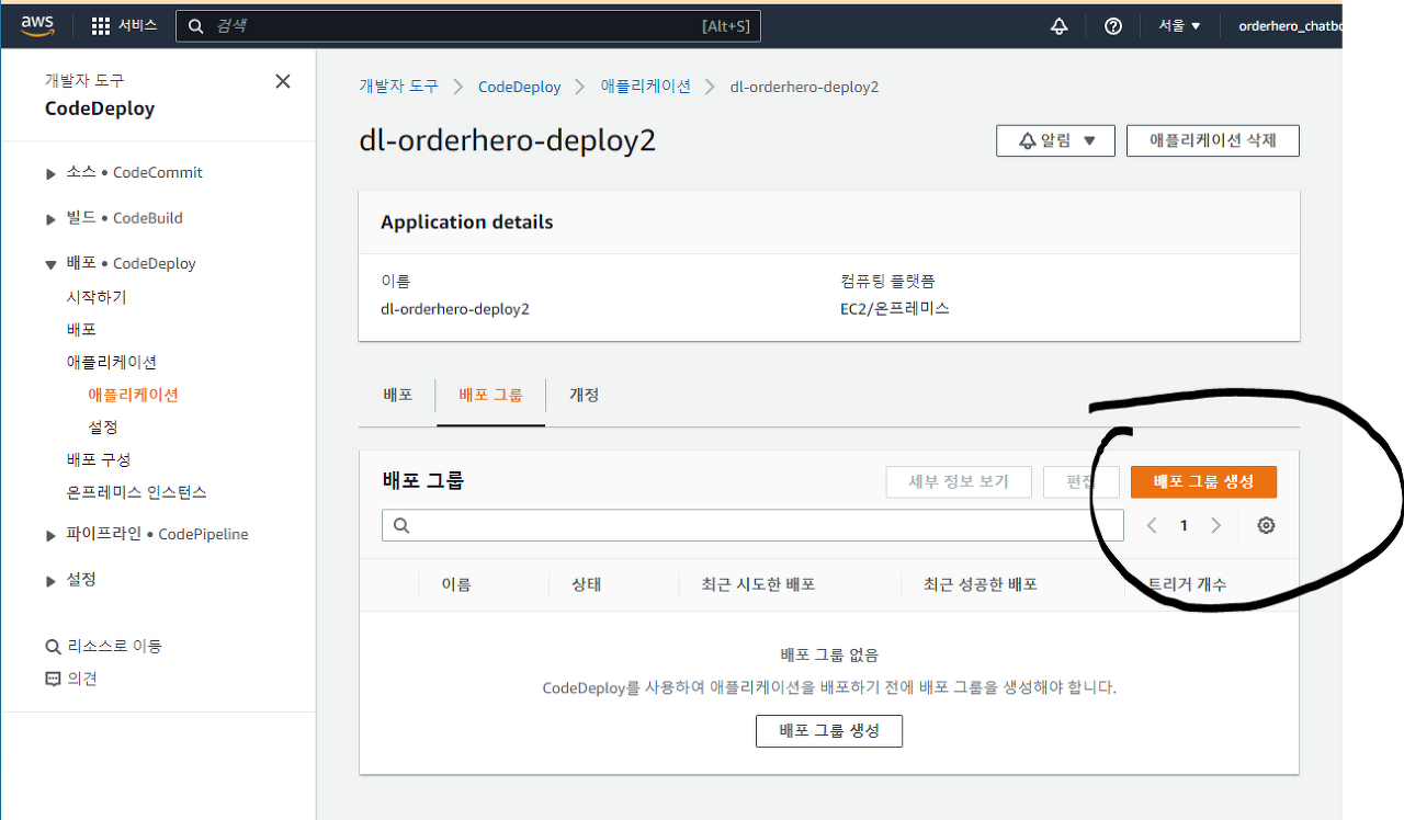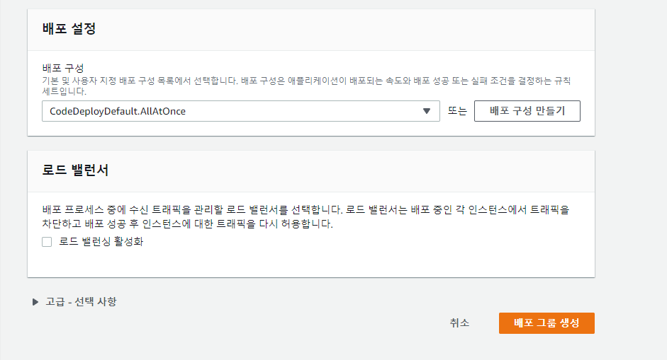 - 사전에 설정한 로드 밸런서가 없다면 배포 그룹 생성 버튼 클릭, CodeDeploy 설정 완료!