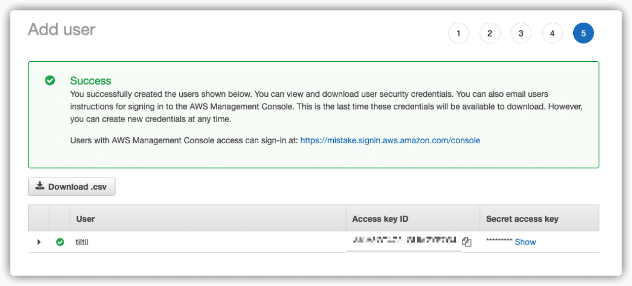 - 사용자가 생성된 후에 Access key ID와 Secret access key는 꼭 로컬 혹은 안전한 위치에 따로 저장해두도록 하자. 이 페이지를 지나가면 다시는 볼 수 없다.