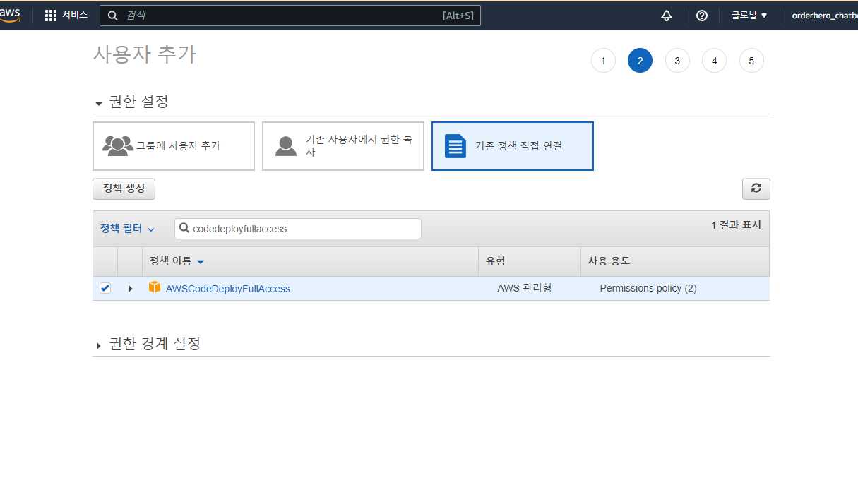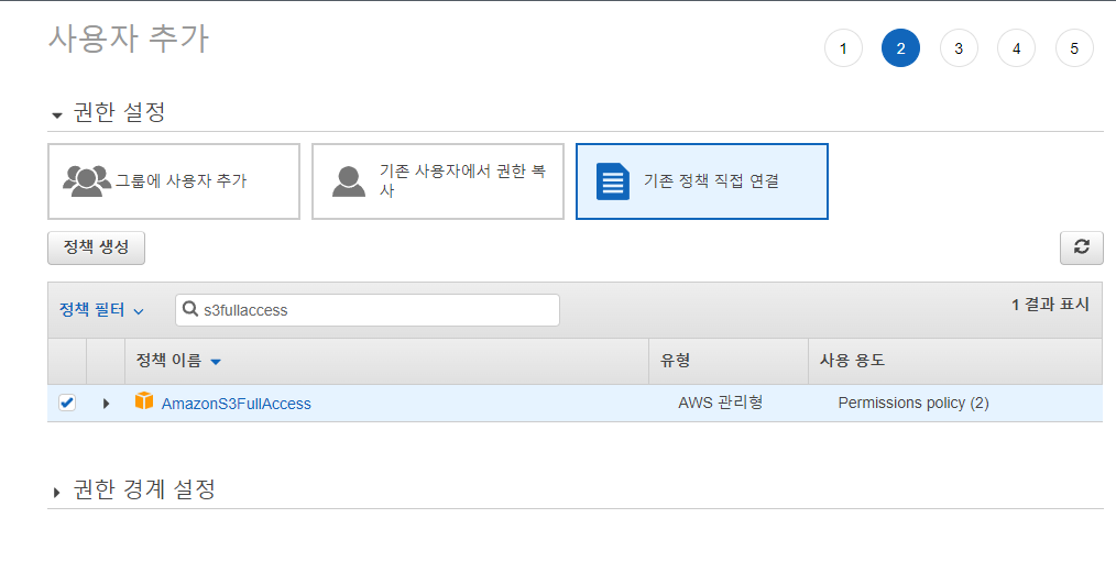 - 기존 정책 직접 연결 클릭 후