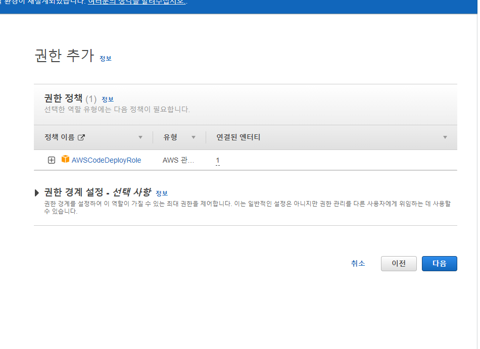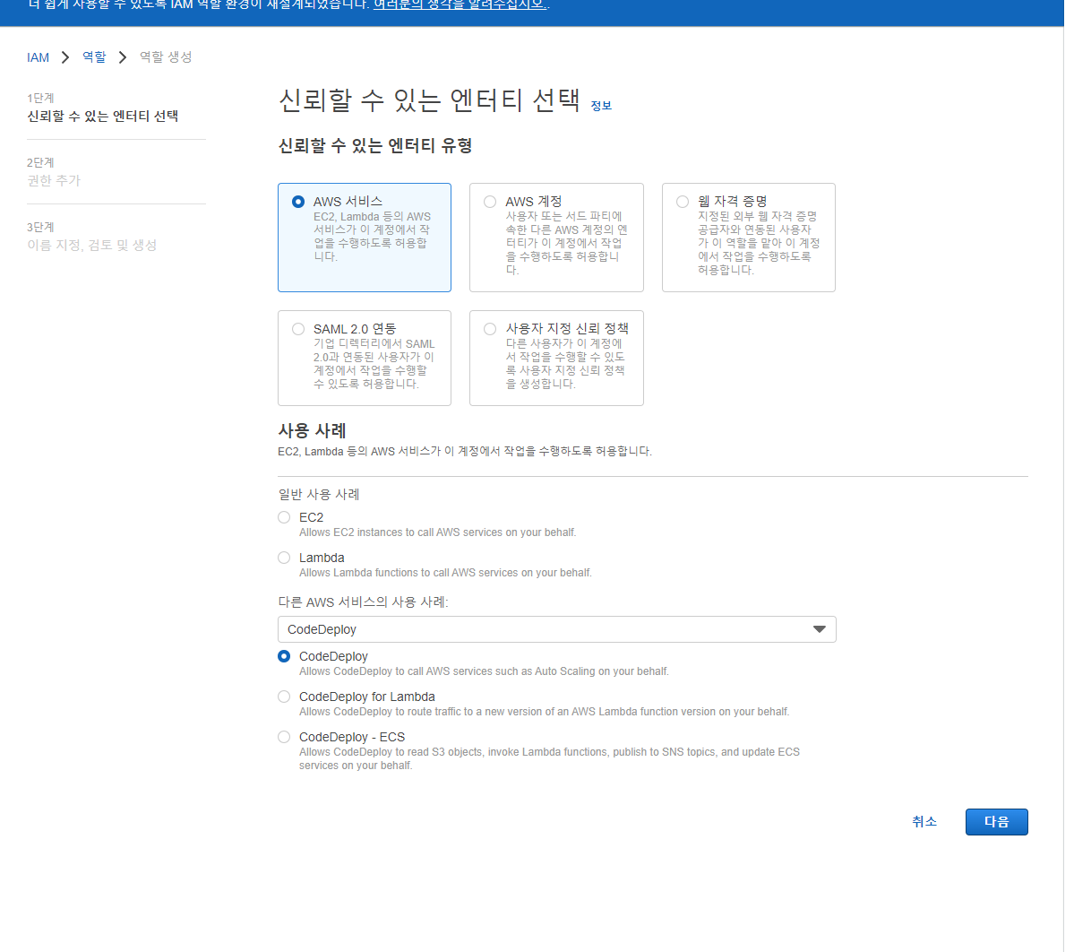 - 다른 AWS 서비스의 사용 사례에서 CodeDeploy 검색해서 선택 후 CodeDeploy 라디오 박스 선택, 다음 버튼 클릭