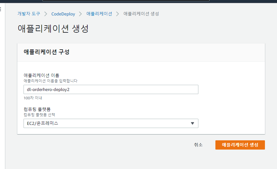 - 애플리케이션 이름을 입력하고 EC2/온프레미스 선택, 애플리케이션 생성 클릭