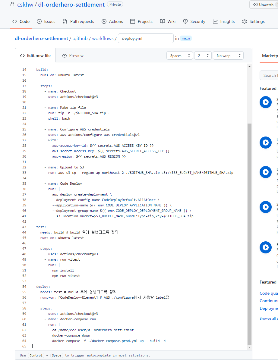 - CODE_DEPLOY_DEPLOYMENT_GROUP_NAME: CodeDeploy 배포 그룹 이름을 그대로 입력