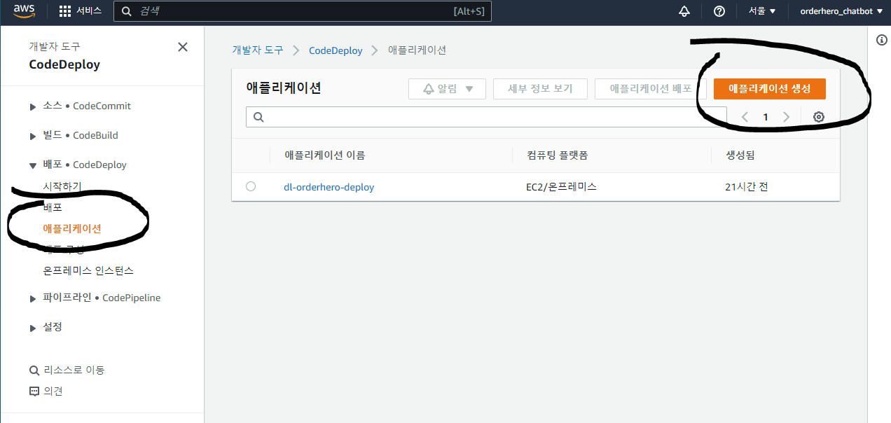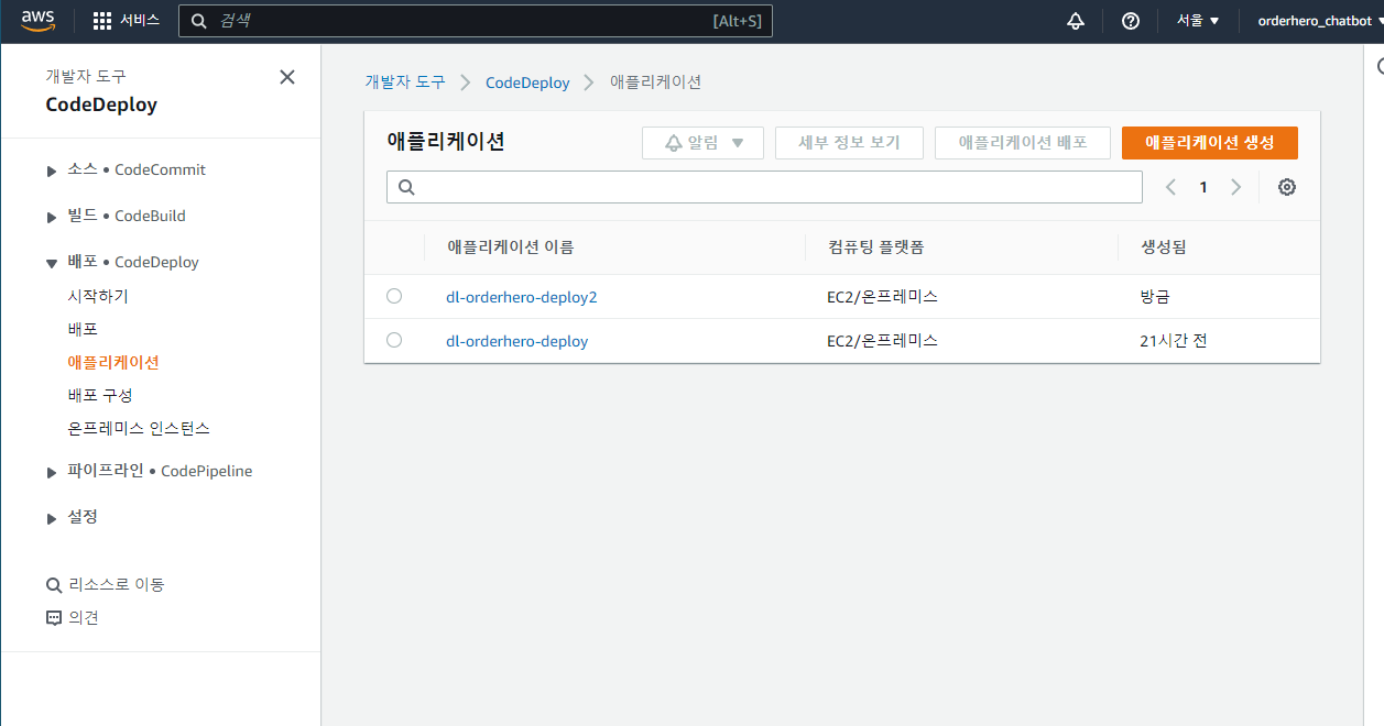 - CodeDeploy의 애플리케이션 탭에서 애플리케이션 생성 버튼 클릭