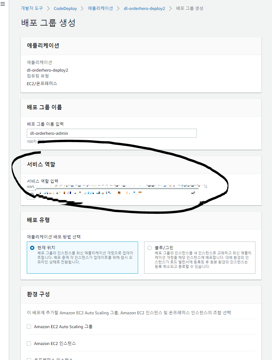 - 배포 그룹 이름 입력, 사전에 생성해준 서비스 역할 선택