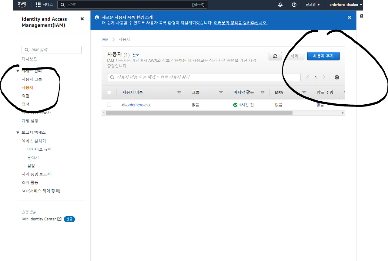 - IAM 메뉴에서 사용자 클릭 후 사용자 추가 클릭