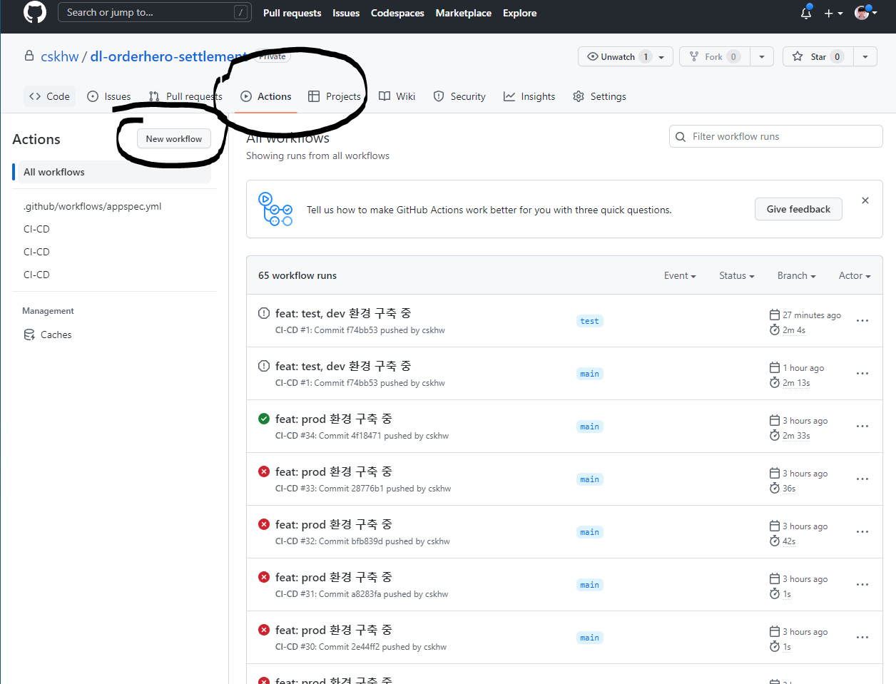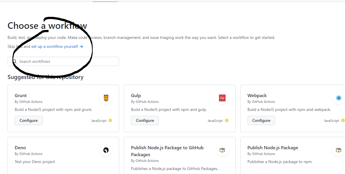 - 레포지토리의 Actions 탭에서 New workflow 버튼 클릭