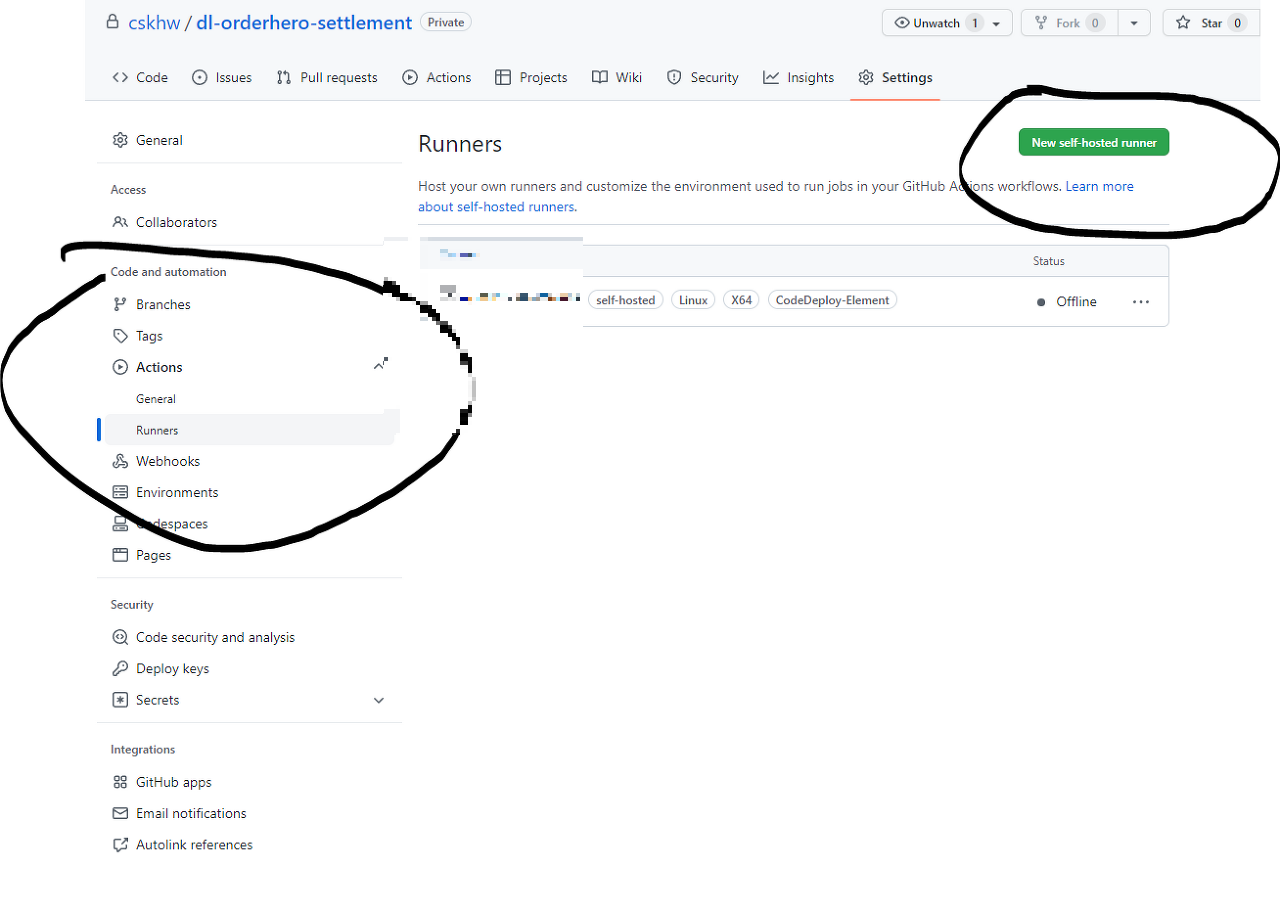 - 레포지토리로 이동해서 Settings의 탭에서 Actions → Runners 클릭, New self-hosted runner 클릭