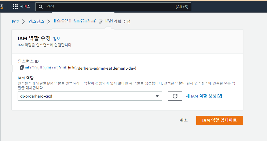 - 미리 생성한 IAM 역할 선택해준 뒤 IAM 역할 업데이트 클릭