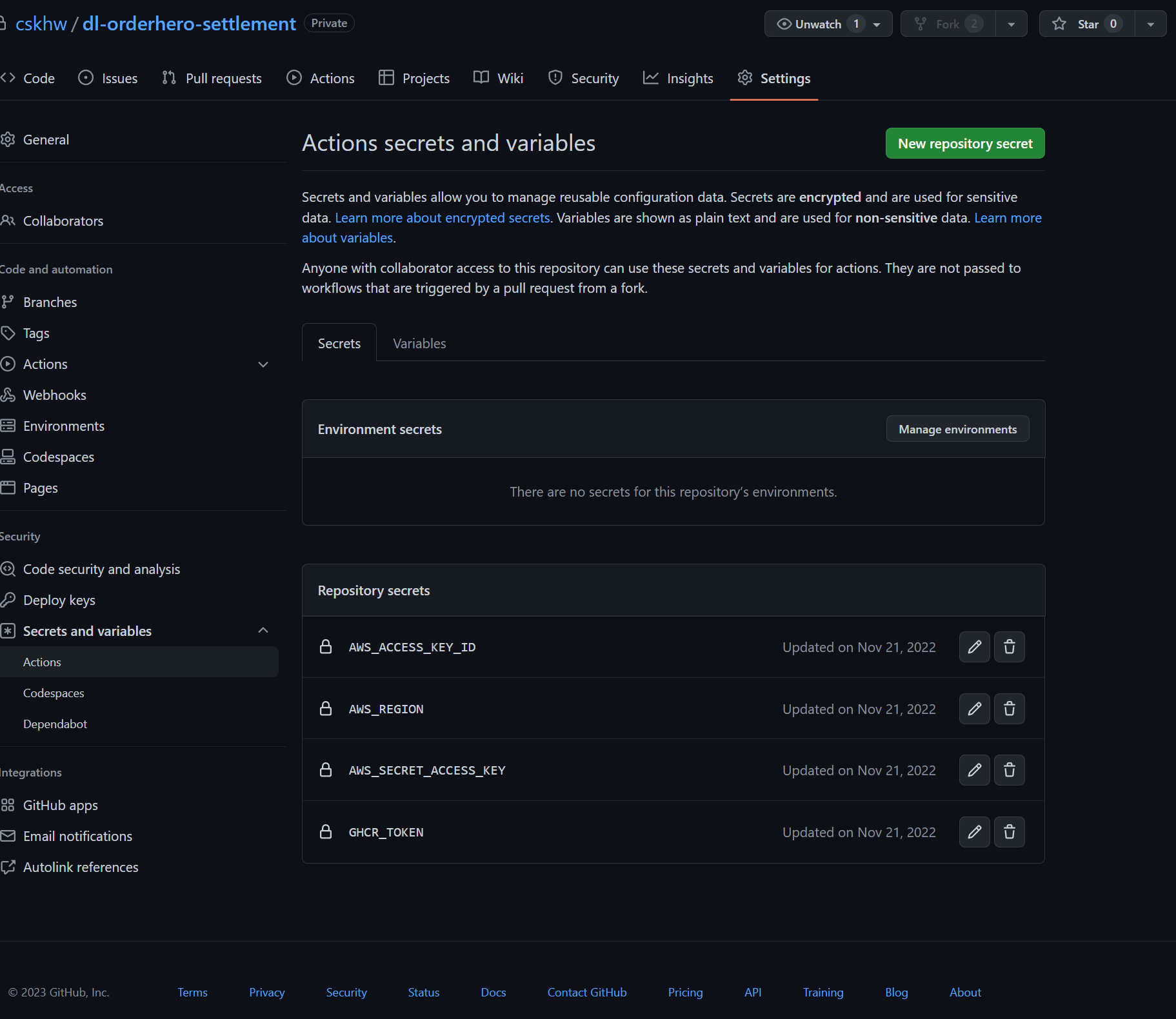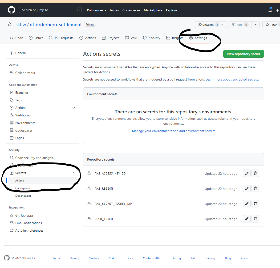 - 깃헙 레포지토리로 이동한 후 Settings 클릭, Secrets → Actions 탭에서