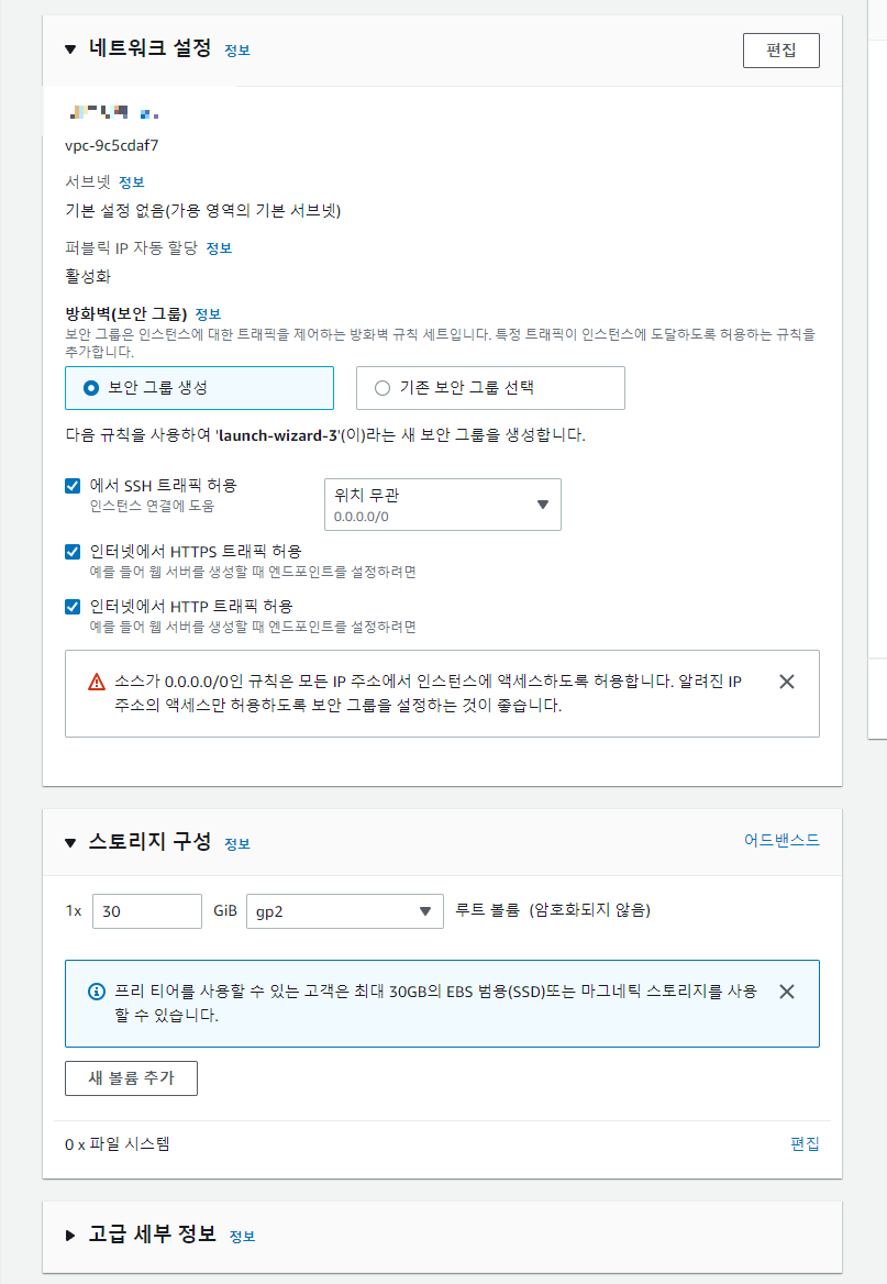 - 네트워크 설정(나중에 필요에 따라 보안 규칙 수정), 스토리지 30GB로 설정(30GB까지 무료)