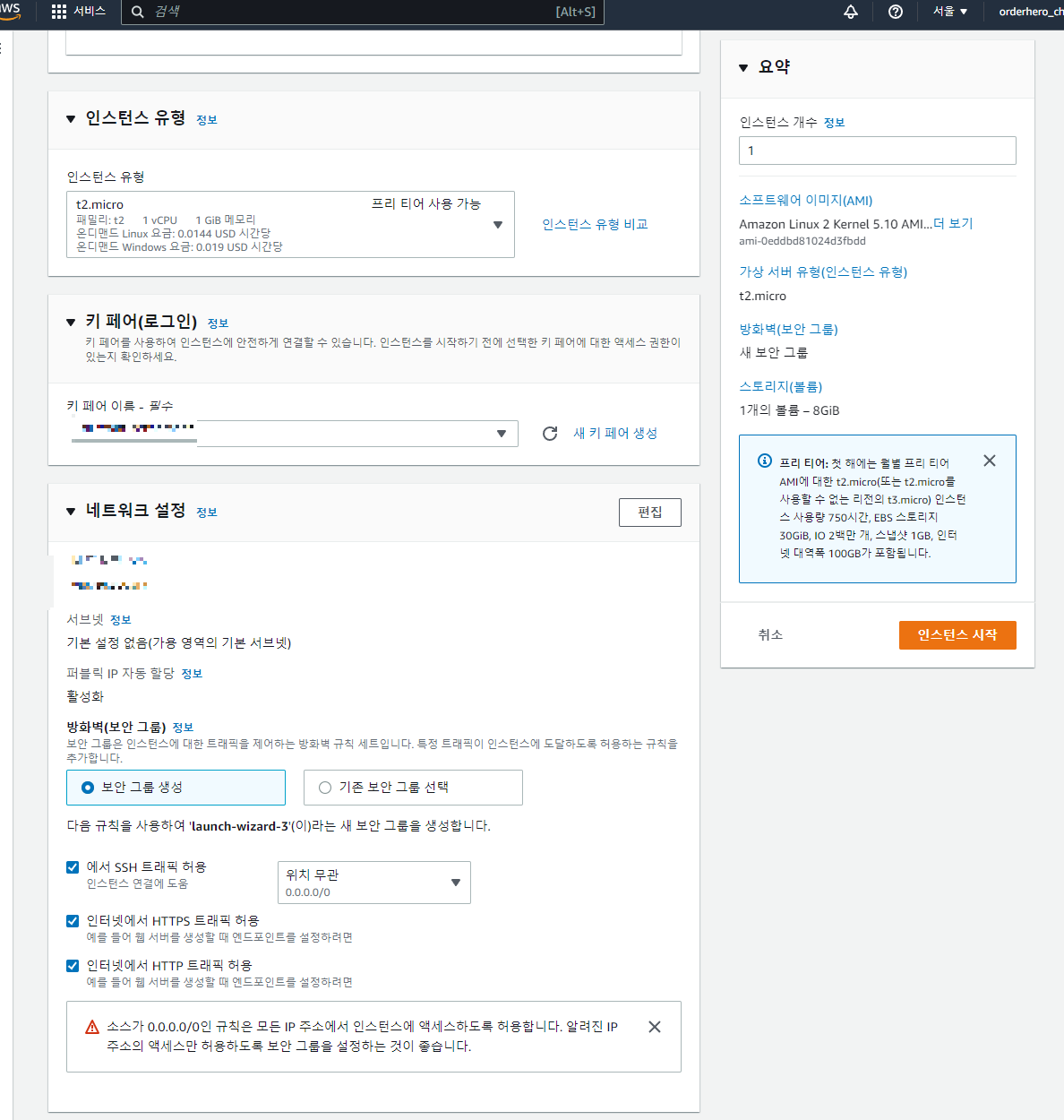 - 인스턴스 유형, 키 페어(로그인에 사용될 키, 새로 생성 했으면 꼭!!! 로컬에 따로 저장해야 함), 네트워크 설정