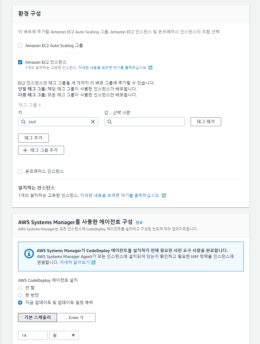 - 환경 구성을 선택한 후 Amazon EC2 인스턴스 클릭, Ec2에 생성해준 태그를 입력