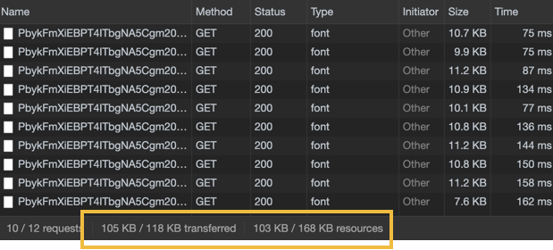 덕분에 웹폰트 전체 용량보다 작은 리소스만 다운로드 하게 된다. 아래는 Noto Sans KR 파일을 여러개로 분리해 다운로드 받은 모습이다.