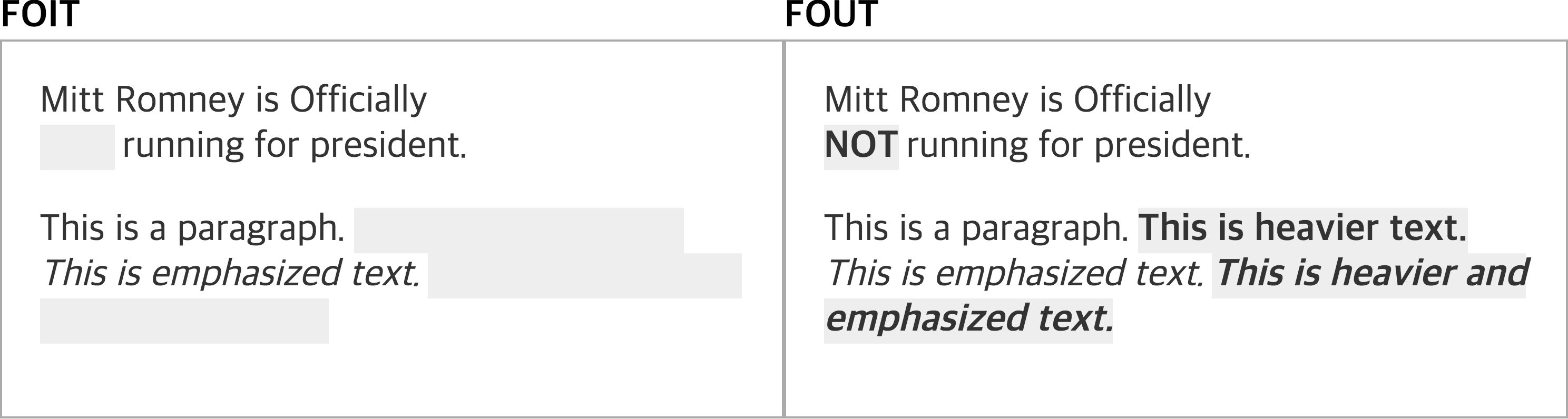브라우저에서 웹폰트 렌더링을 차단하는 방법은 2가지로 나뉜다. IE는 FOUT(Flash of Unstyled Text) 방식을 따르고, 그 외 브라우저는 FOIT(Flash of Invisible Text) 방식을 따른다.