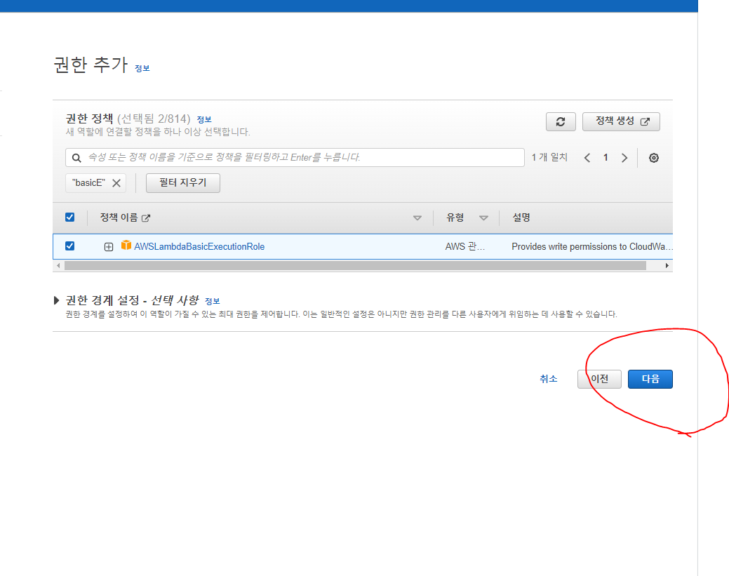 AWSLambdaBasicExecutionRole 도 추가해주고 다음으로 넘어간다.