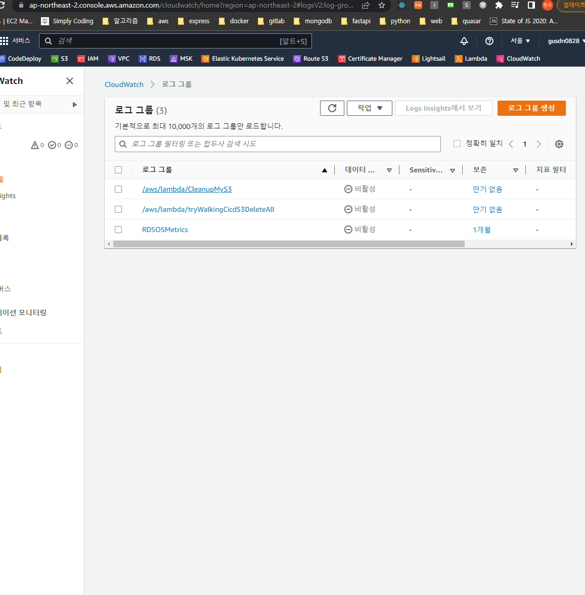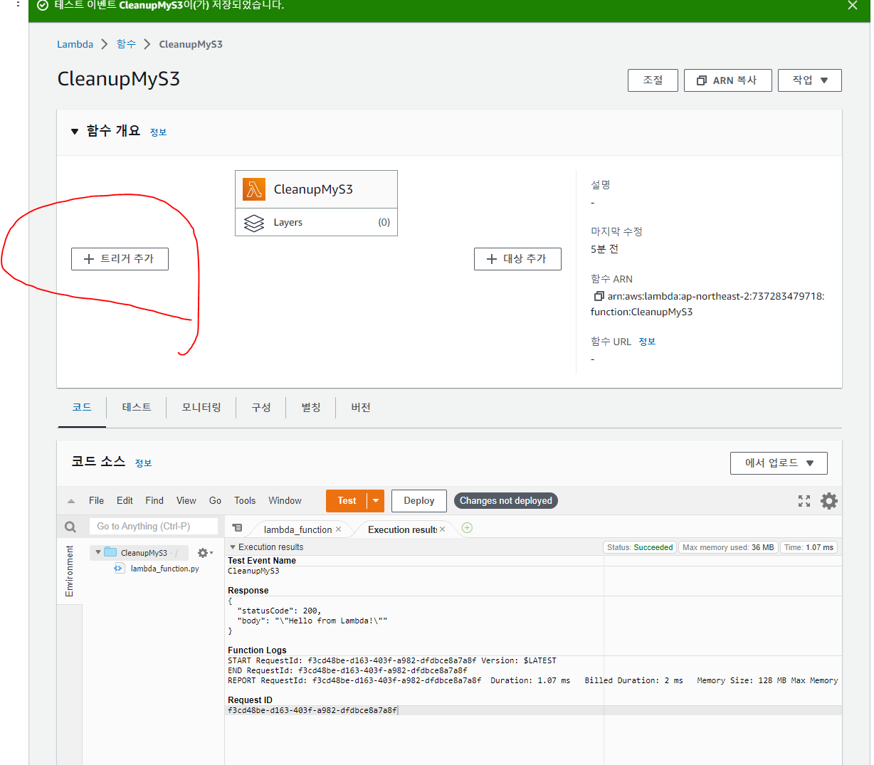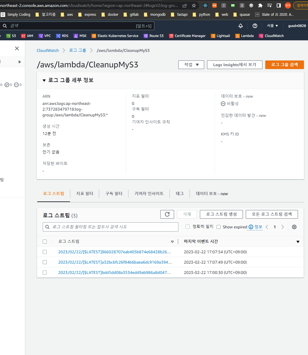 추가를 클릭한 후 제대로 생성 되었는지 확인한다. 크론이 제대로 도는지 확인하는 방법은 S3에 아무 객체나 추가한 후 실행 주기를 하루가 아닌 매시 1분마다로 설정하고 S3의 파일이 지워지는지 확인하면 된다.