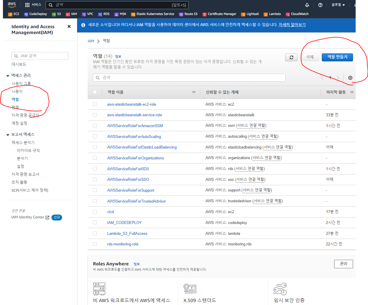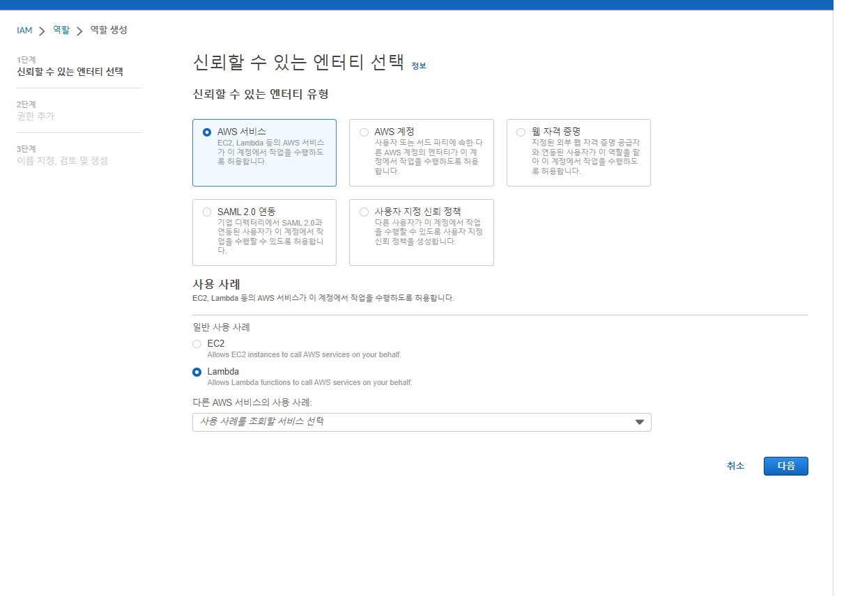 일단 AWS 람다에서 사용할 IAM 역할을 만들어준다. IAM에서 역할을 선택한 후 역할 만들기를 클릭한다.
