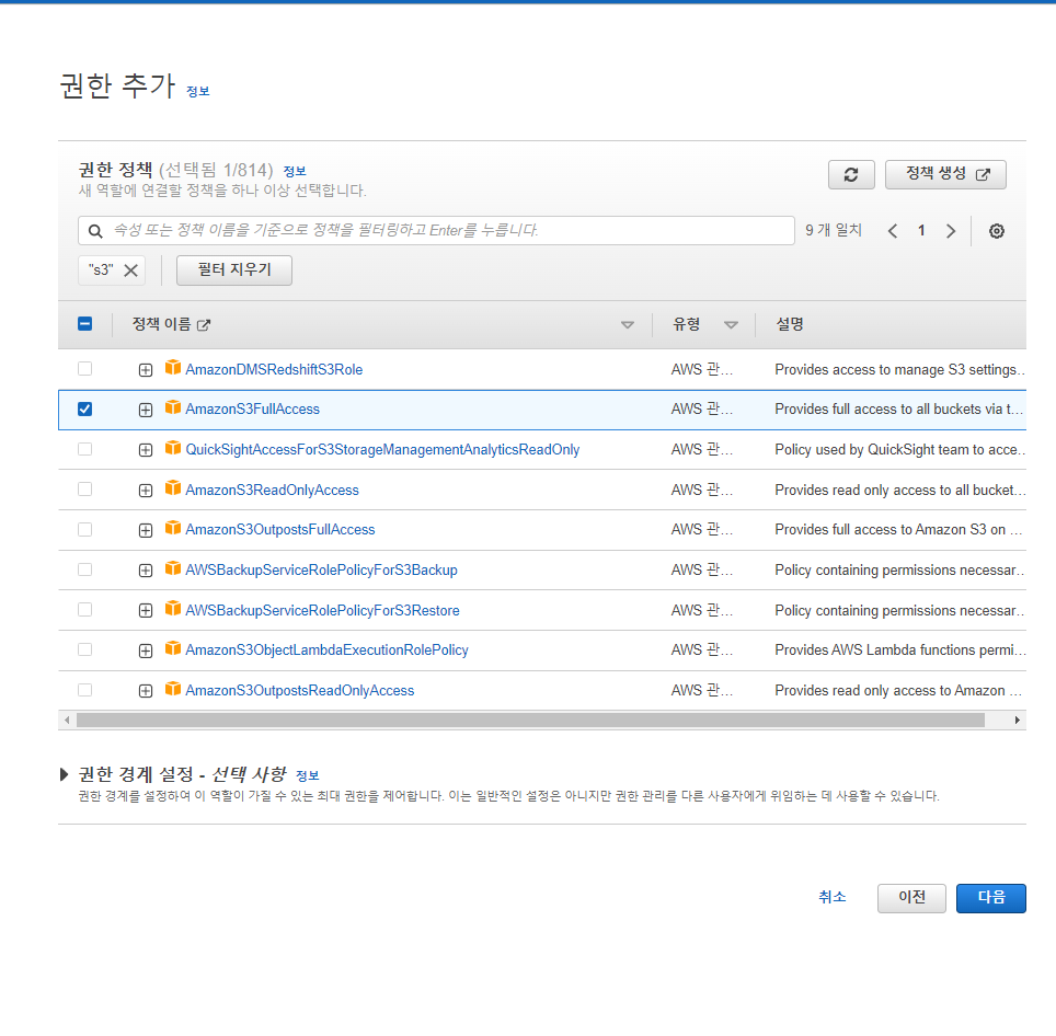 - 아래 기존 역할 셀렉트에서 이전에 생성해준 IAM 역할 선택