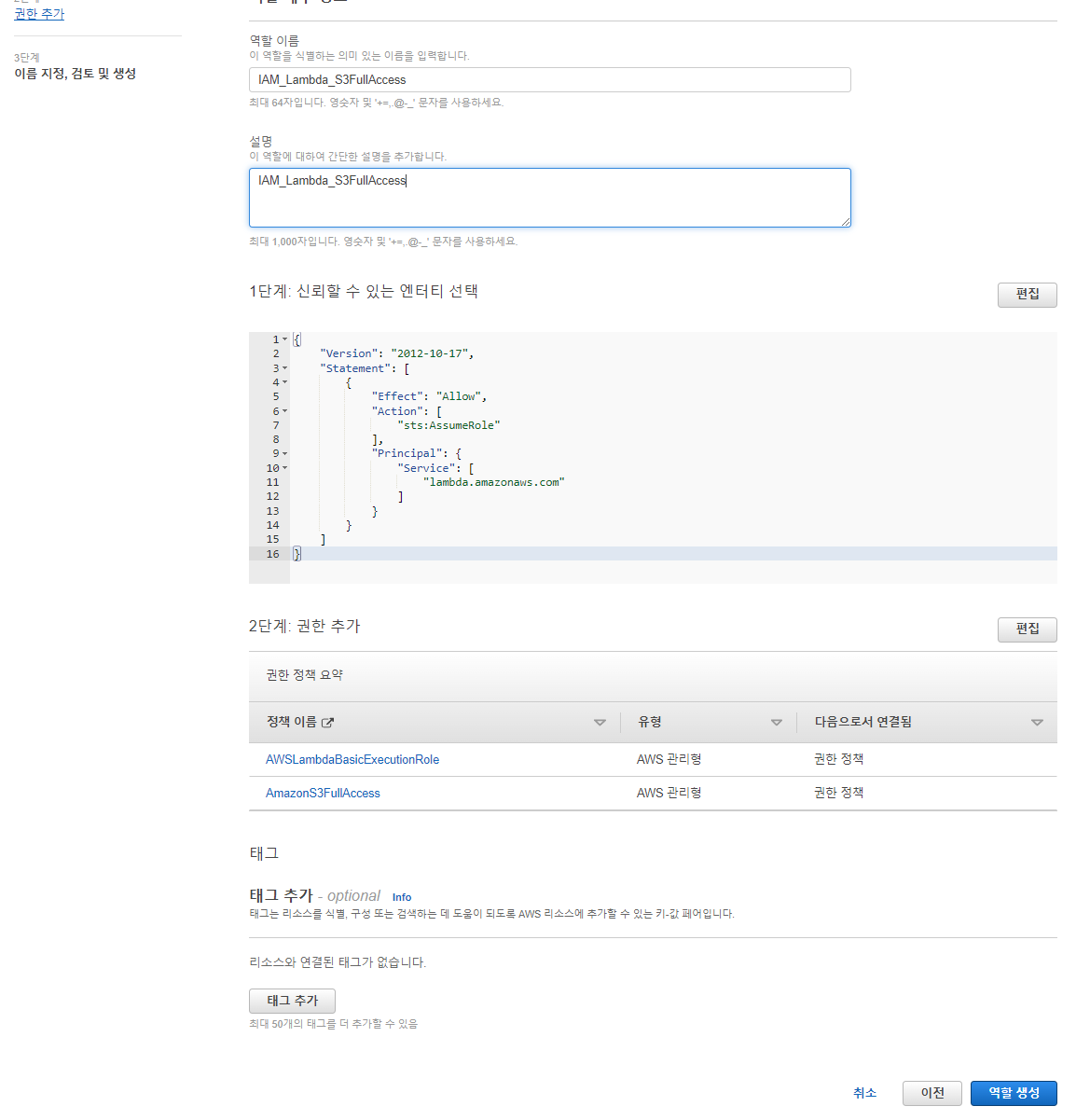 역할 이름과 설명을 적고, 정책이 제대로 추가되었는지 확인한 후 역할 생성을 클릭한다.