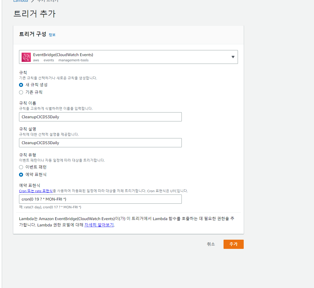 - 아래 예약 표현식에 크론 함수 입력 -> cron(0 19 ? * MON-FRI *)
