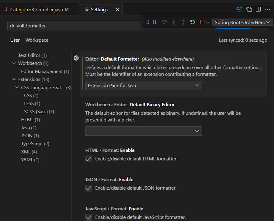 - 컨트롤 + 쉬프트 + P > user settings (Json 아닌걸로) > 검색에서 “default formatter” 검색 > Default Formatter에서 Extension Pack for Java 선택