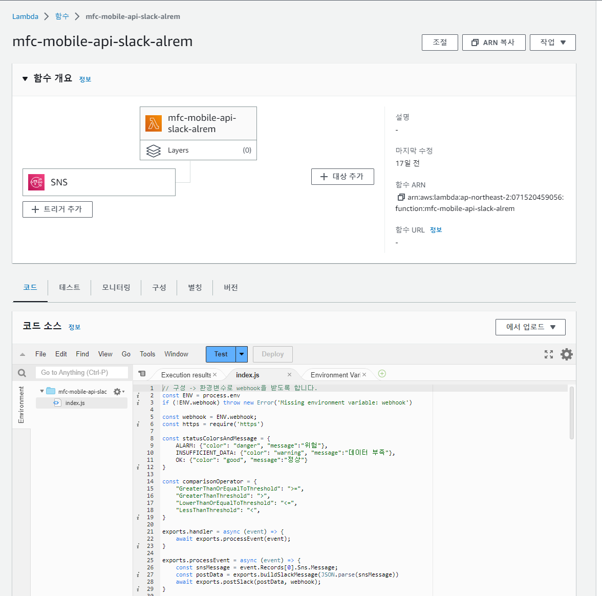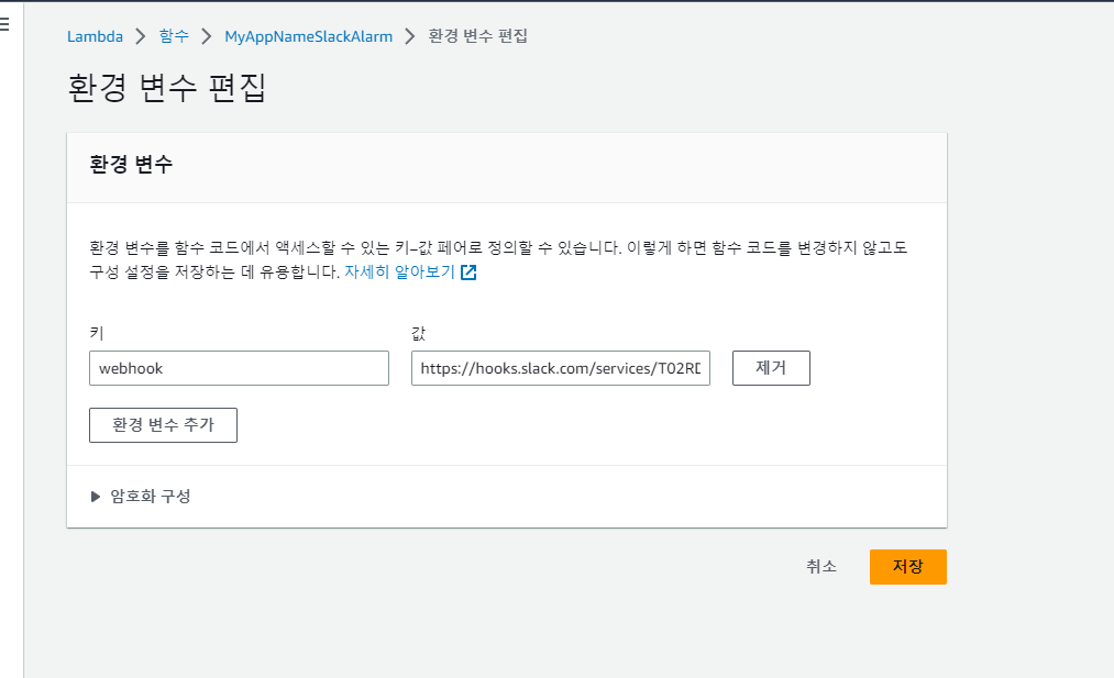 구성 탭을 클릭한 후 환경 변수 탭에서 webhook 환경 변수를 추가해줌. 이 변수가 메세지를 보낼 슬랙 URL이 됨