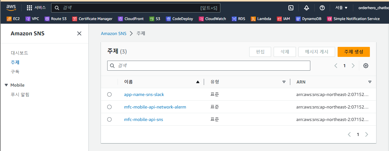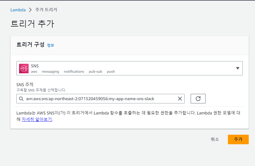 SNS를 선택하고 미리 생성해둔 주제 선택 후 추가 클릭