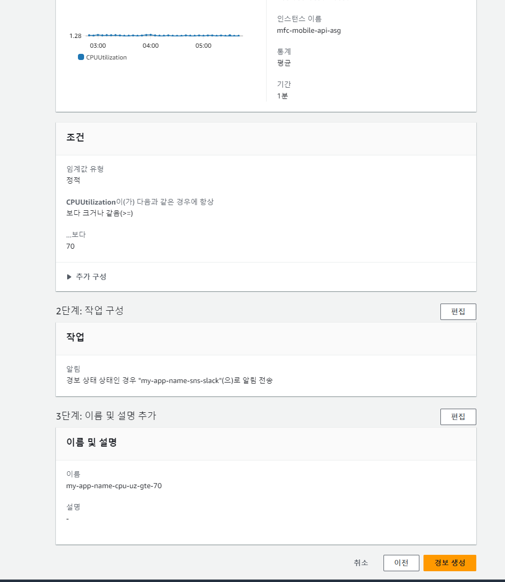 - CPU 사용량은 실시간 값이므로 해당 지표에서 가장 짧게 확인할 수 있는 주기인 1분 선택