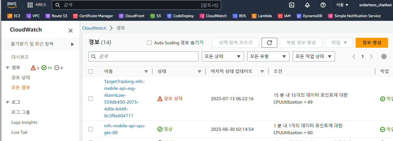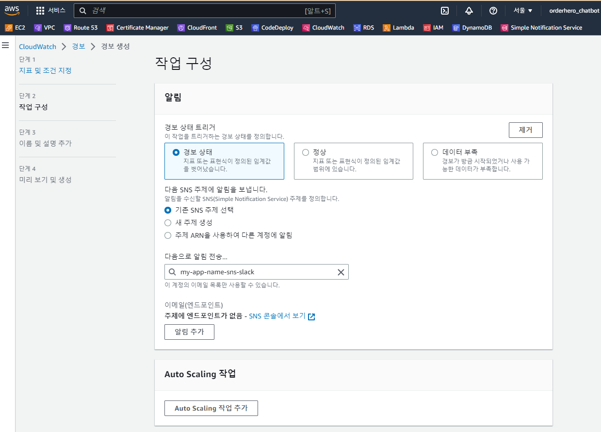 경보 상태가 되면 연동된 SNS에 시그널이 가고 람다 함수가 실행됨