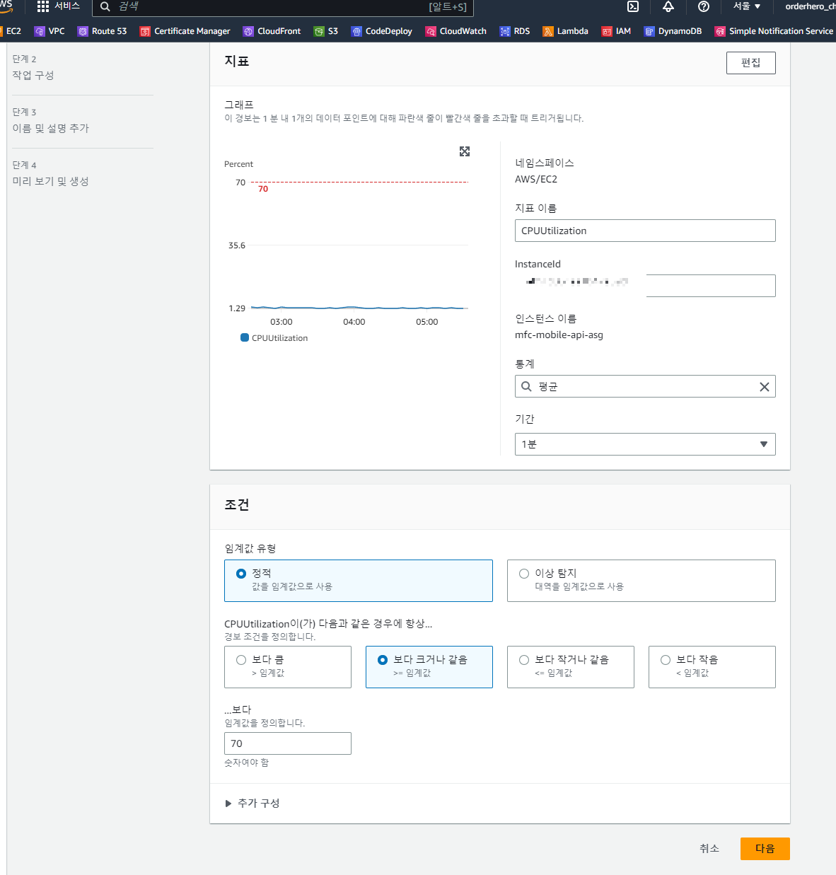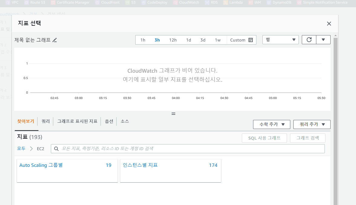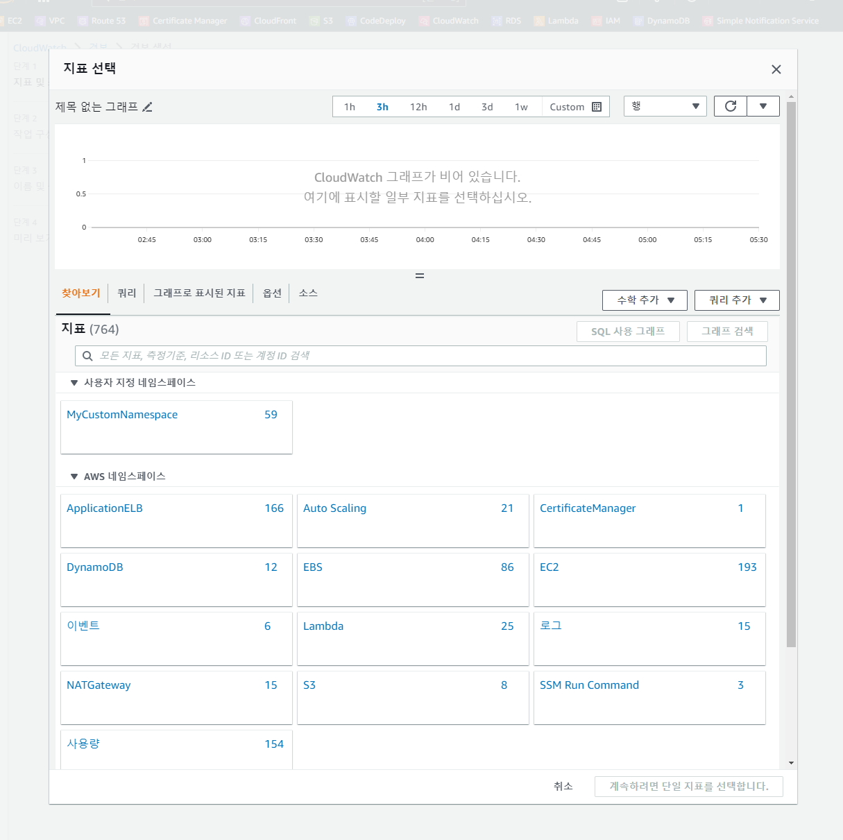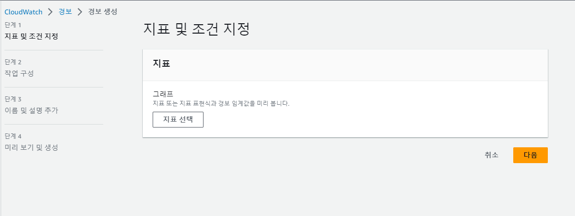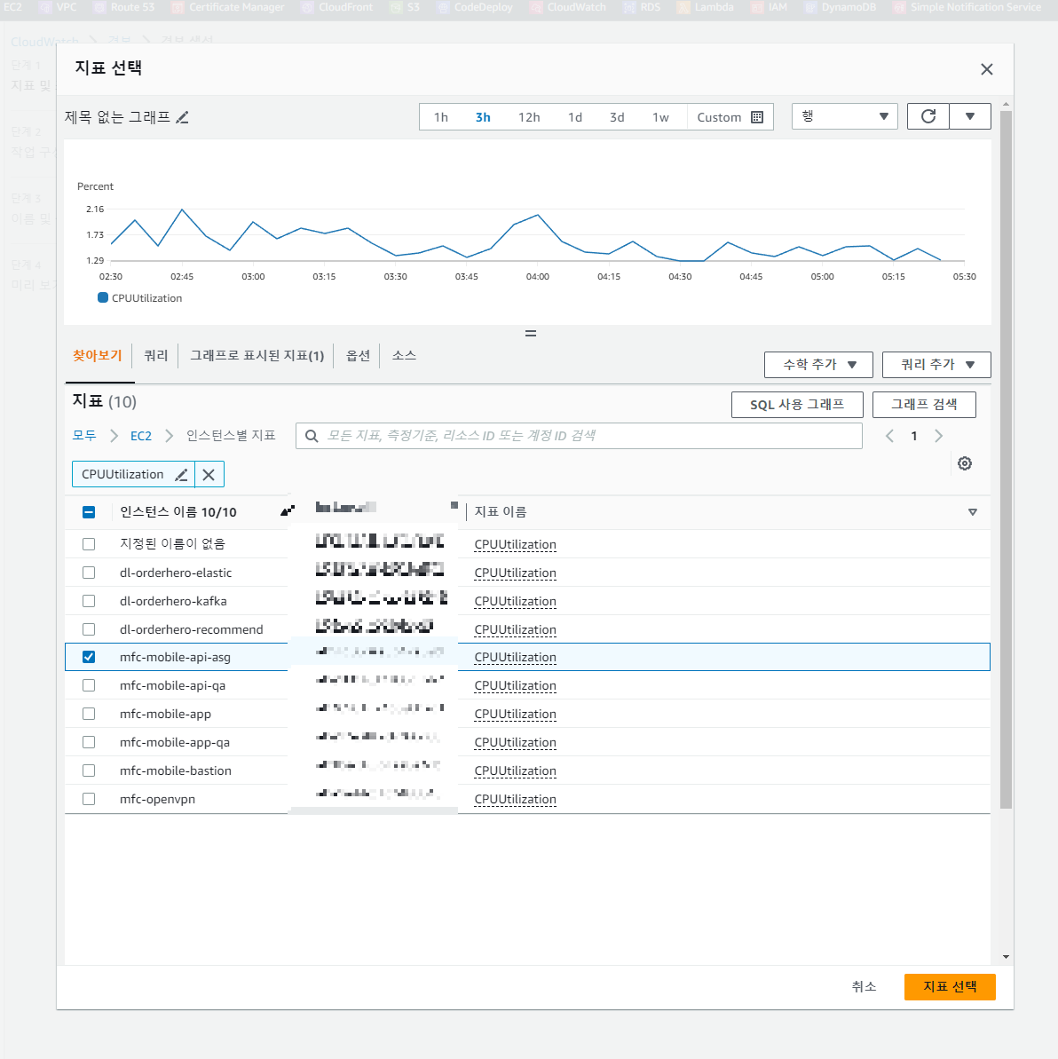 검색에 CPUUtilization 을 입력하면 인스턴스들의 해당 지표 항목만 볼 수 있다. 원하는 지표를 클릭하면 아래와 같이 그래프를 미리 볼 수 있다. 지표 선택 클릭