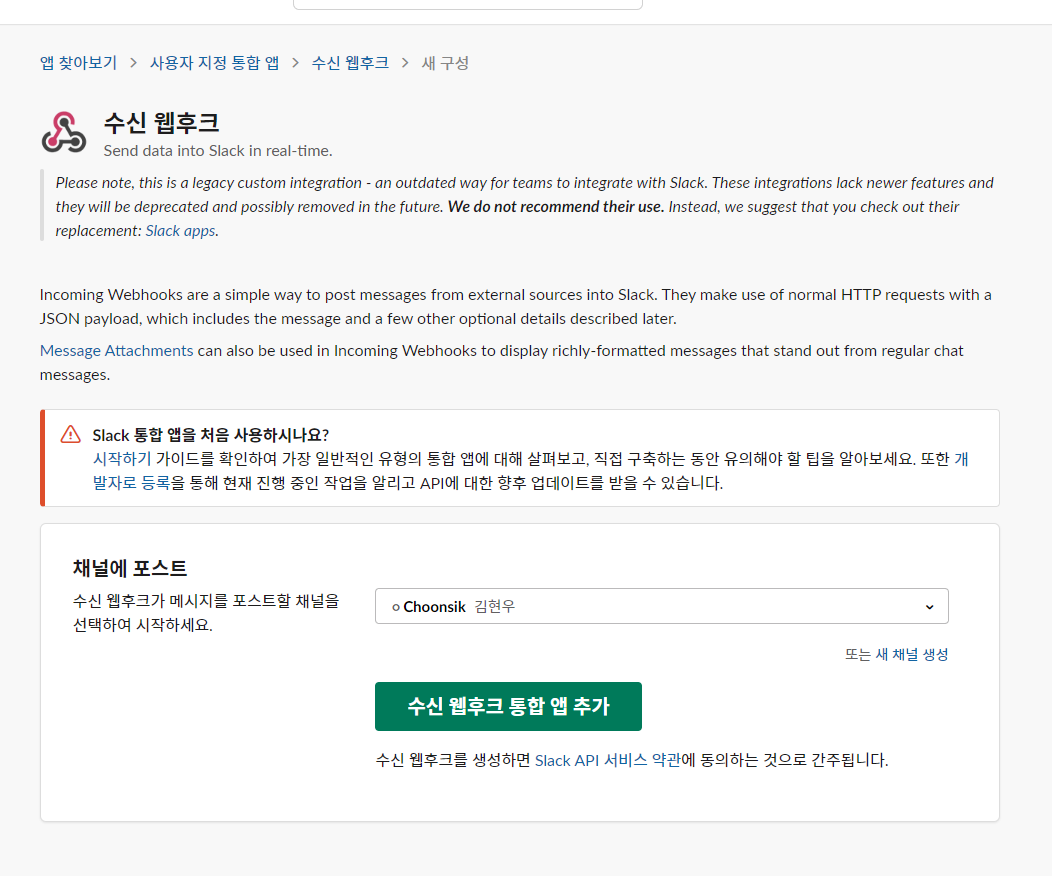 채널을 선택한 후에 수신 웹후크 통합 앱 추가 버튼을 클릭하면 채널에 추가됨 메시지가 뜸과 동시에 http 요청을 보낼 slack URL이 생성됨.