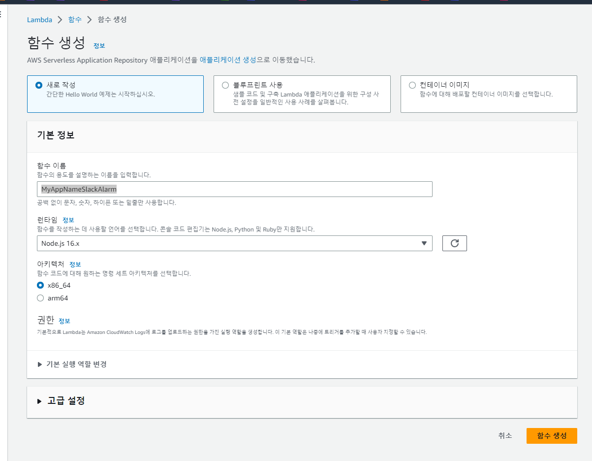 아래와 같이 설정하고 함수 생성, node 16 버전 코드를 사용 할 것이므로 16으로 골라줌