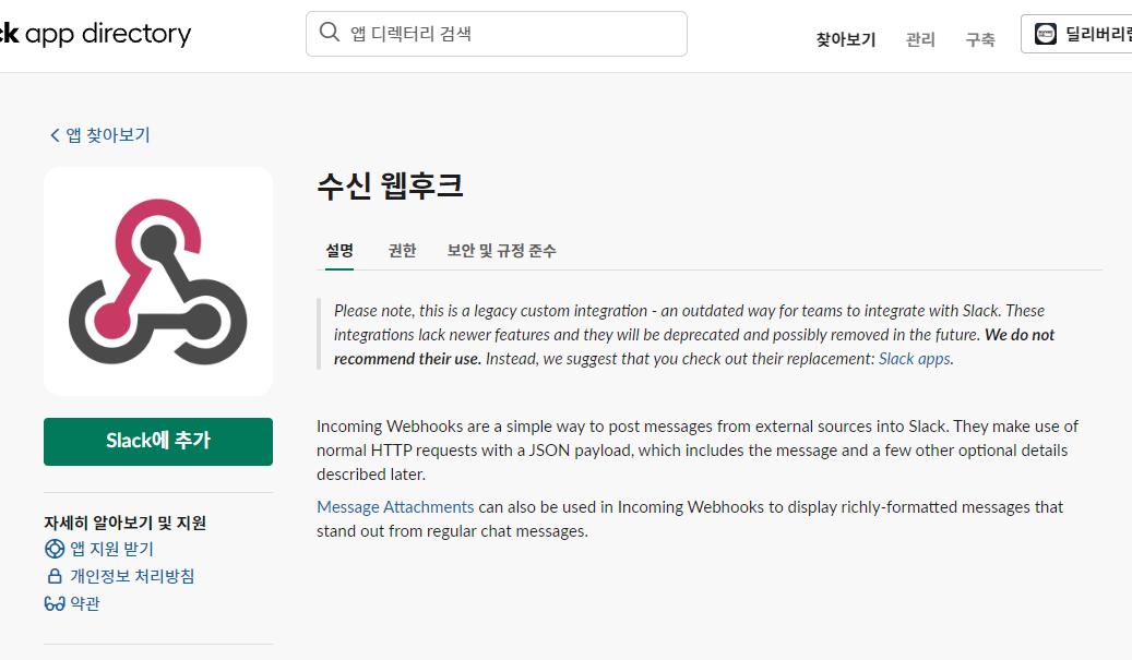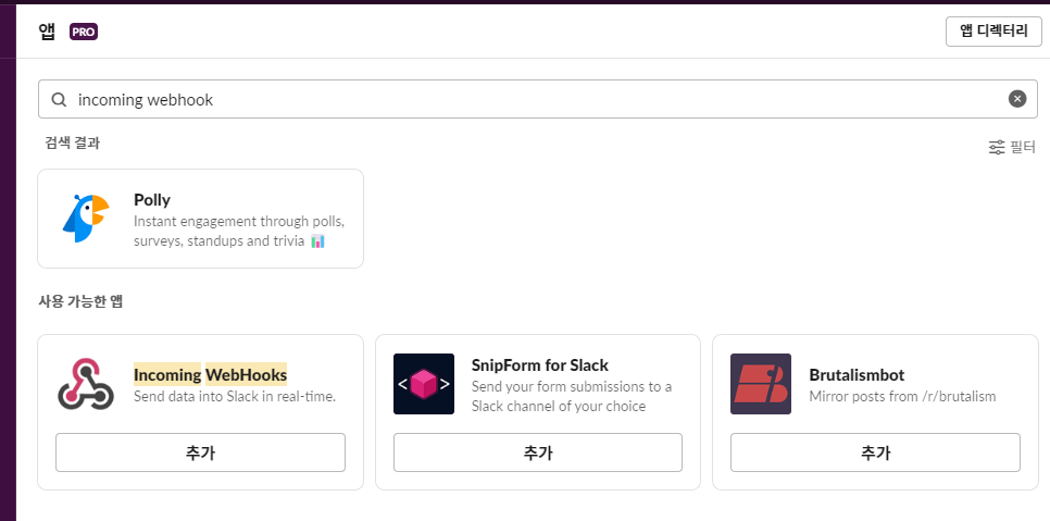 Slack의 앱추가에서 incoming webhook을 검색해 추가 클릭