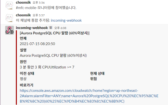 "Message": "{\"AlarmName\":\"MFC 모바일 테스트 CPU 알람 (80%이상시)\",\"AlarmDescription\":\"MFC 모바일 테스트 CPU 알람 (80%이상시)\",\"AWSAccountId\":\"981604548033\",\"NewStateValue\":\"ALARM\",\"NewStateReason\":\"Threshold Crossed: 3 out of the last 3 datapoints [8.891518474692088 (14/07/21 23:18:00), 9.72 (14/07/21 23:17:00), 9.18241509182415 (14/07/21 23:16:00)] were greater than or equal to the threshold (7.0) (minimum 3 datapoints for OK -> ALARM transition).\",\"StateChangeTime\":\"2021-07-14T23:20:50.708+0000\",\"Region\":\"Asia Pacific (Seoul)\",\"AlarmArn\":\"arn:aws:cloudwatch:ap-northeast-2:981604548033:alarm:Aurora PostgreSQL CPU 알람 (60%이상시)\",\"OldStateValue\":\"OK\",\"Trigger\":{\"MetricName\":\"CPUUtilization\",\"Namespace\":\"AWS/RDS\",\"StatisticType\":\"Statistic\",\"Statistic\":\"MAXIMUM\",\"Unit\":null,\"Dimensions\":[{\"value\":\"aurora-postgresql\",\"name\":\"EngineName\"}],\"Period\":60,\"EvaluationPeriods\":3,\"ComparisonOperator\":\"GreaterThanOrEqualToThreshold\",\"Threshold\":7,\"TreatMissingData\":\"- TreatMissingData: ignore\",\"EvaluateLowSampleCountPercentile\":\"\"}}",