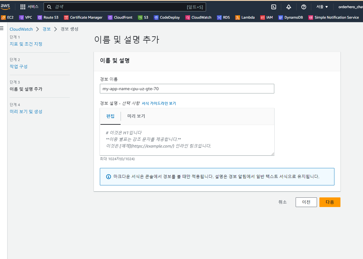 경보 이름 설정, 규칙은 자유 내가 쓴 규칙은 앱이름-지표이름-조건(greater then and equal -> gte)