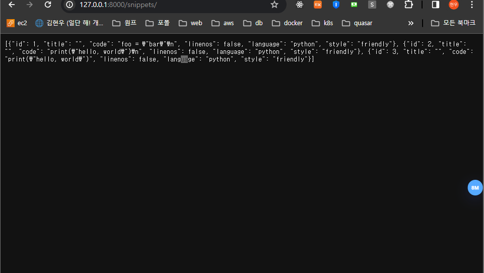 http://127.0.0.1:8000/snippets/ 로 입력하면 아래와 같이 json을 볼 수 있음