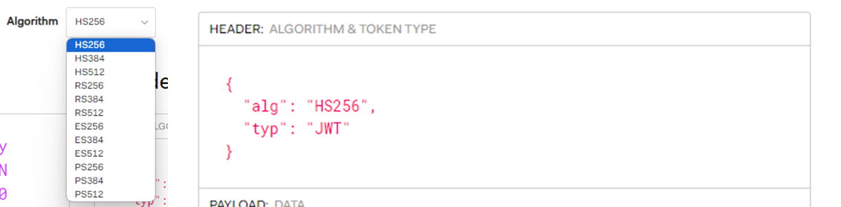 Hashing 알고리즘은 보통 HS256 을 사용하지만, 위 사진과 같이 여러 알고리즘을 지원한다.