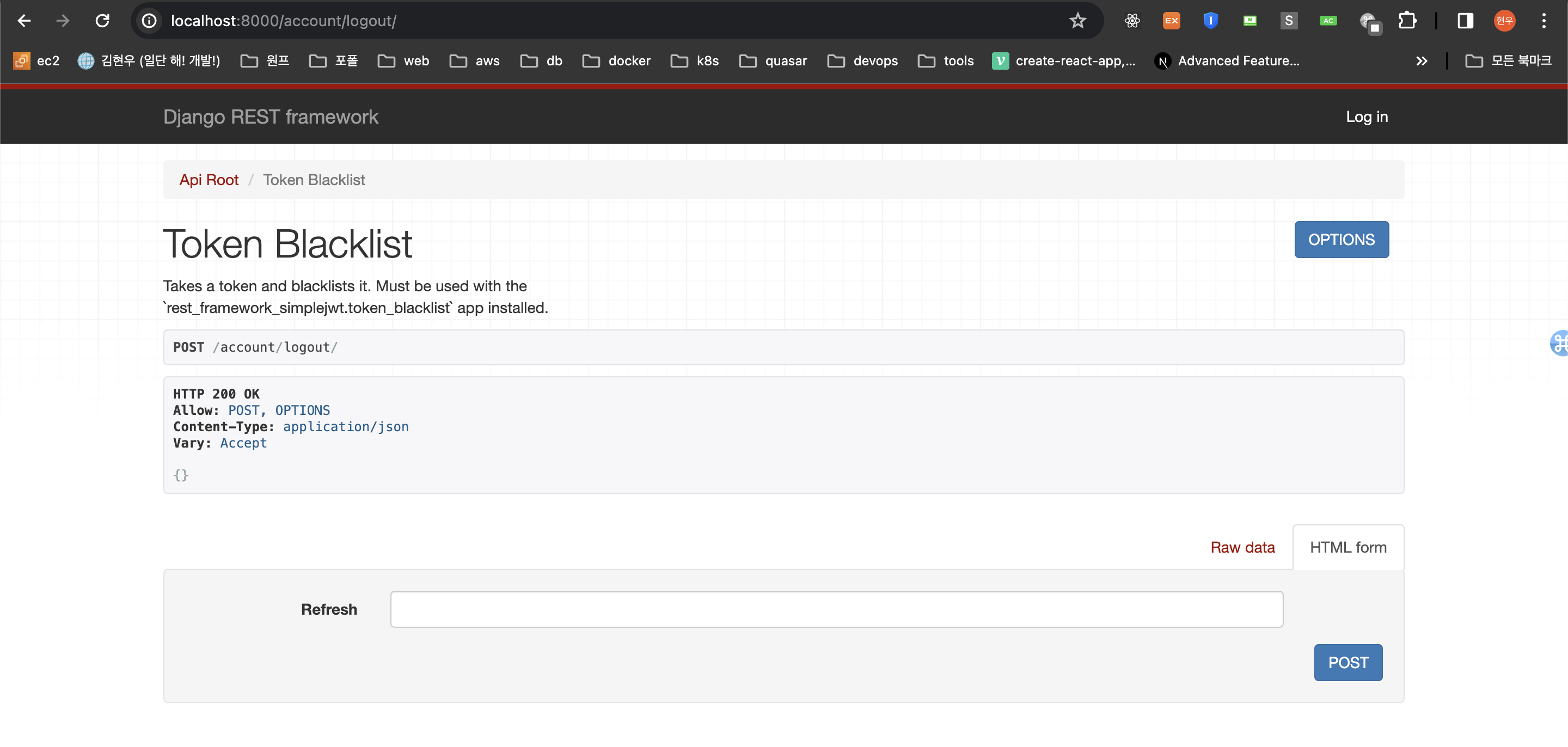아까 복사한 토큰을 넣어서 logout API에 Post로 요청한다. 200 코드를 확인할 수 있다.