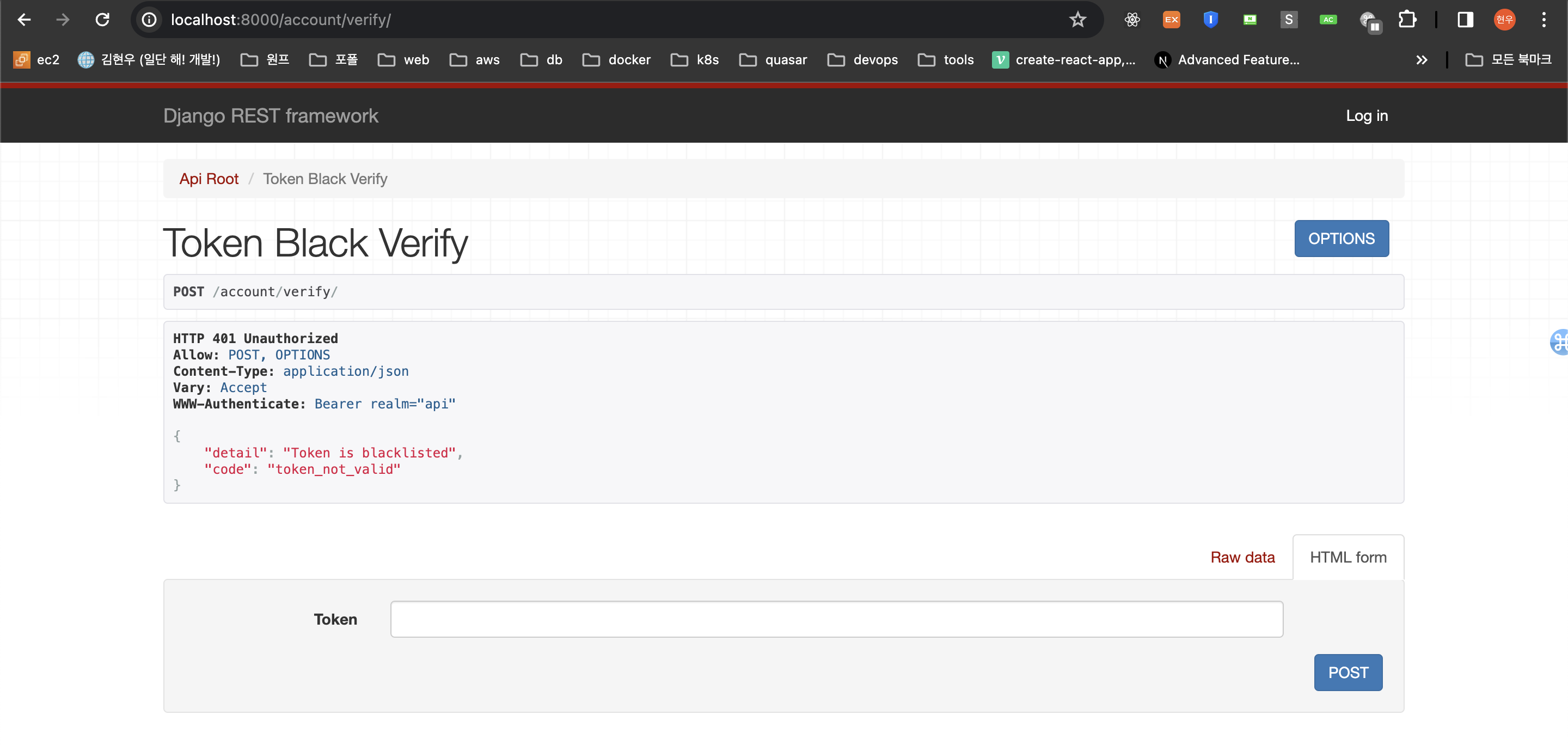 다시 verify API로 가서 동일한 토큰으로 요청을 보내면 아래와 같이 Blacklisted 된 토큰이라는 메세지를 볼 수 있다.