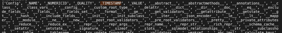 위의 메소드를 많이 사용하곤 한다. 하지만 여기서 키를 못 가져오는 경우가 있는데 필드 이름 앞에 _가 붙은 경우다. 필자의 경우에는 타임스탬프 필드를 가져와야 했는데 필드 이름이 _TIMESTAMP로 되어 있어서 해당 필드를 가져올 수 없었다. 그럴 때 사용할 수 있는 파이썬의 내장 함수가 있다. 필자의 SQLModel 코드는 아래와 같다.