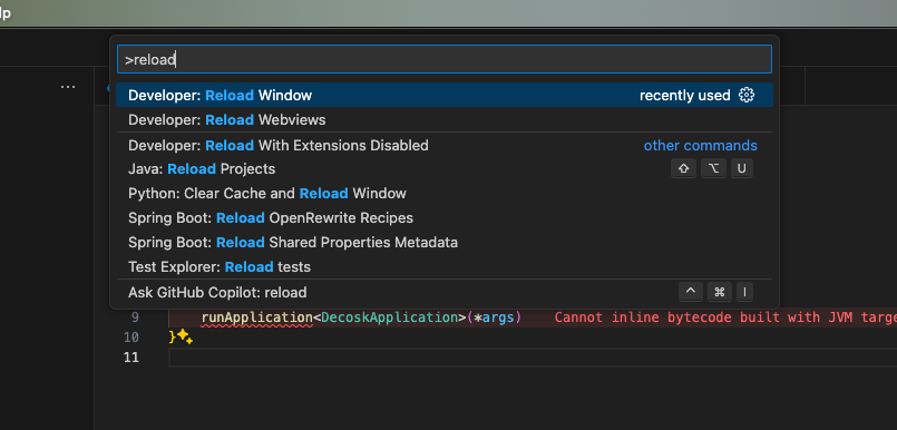 - 그리고 커맨드 창에 reload를 입력하여 vscode를 재실행한다.