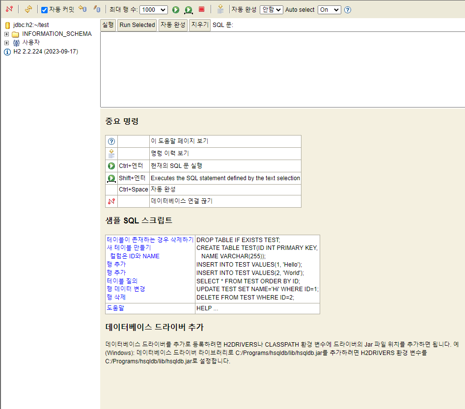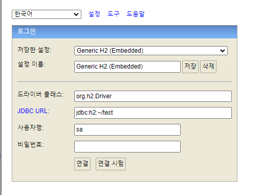 H2를 설치하면 자동으로 ~/test 경로에 설치된다. 이제 h2 콘솔을 켠다. 윈도우 검색 창에 h2를 입력하면 h2 console이 뜬다.