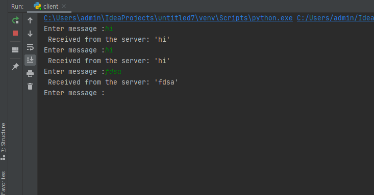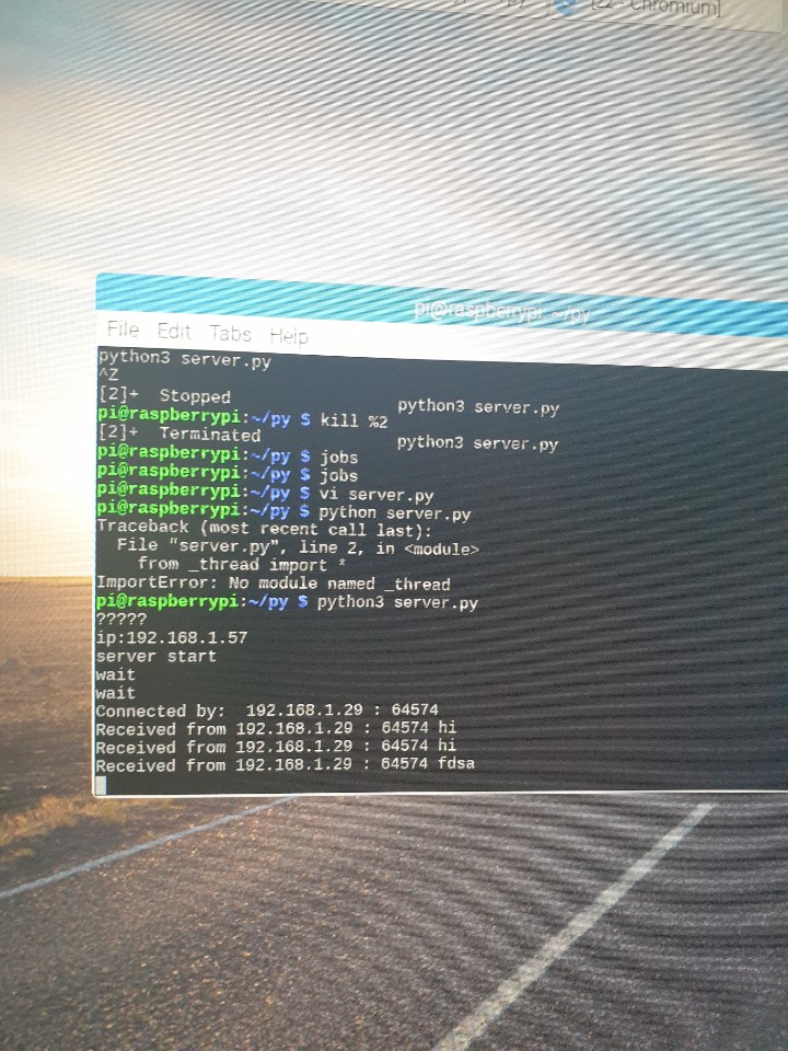 이제 라즈베리파이에서 python3 server.py 명령어로 서버 코드를 실행시킨 후 클라이언트 코드를 실행시켜줍니다.