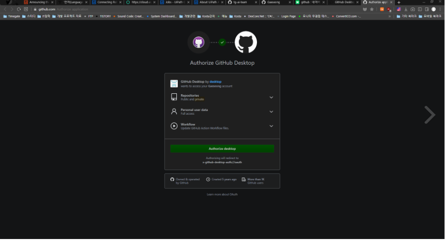 브라우저에 위와 같은 화면이 뜨면 Authorize desktop 버튼을 눌러줍니다.