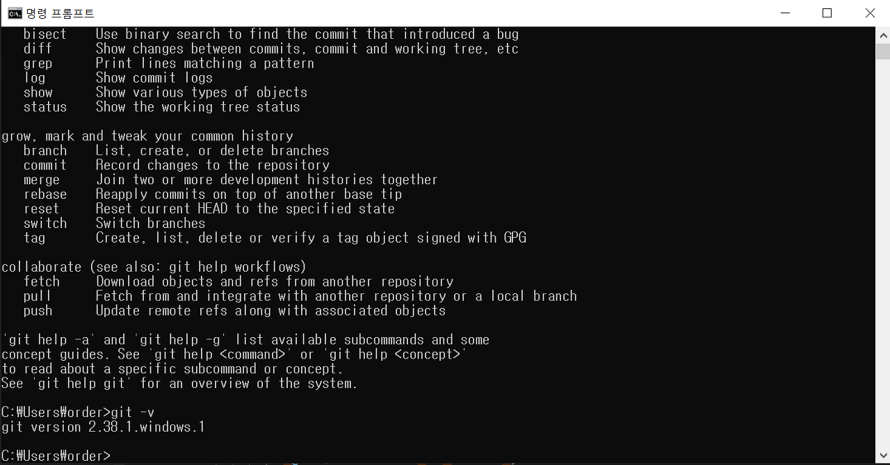 이제 window키 + s 를 누른 후 cmd를 실행하고 명령어 창에 git -v를 입력해주세요.